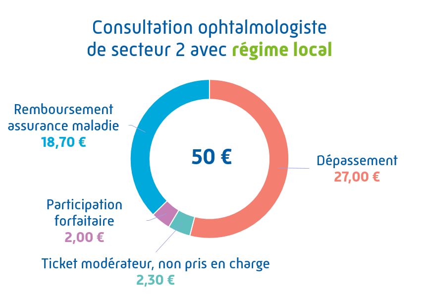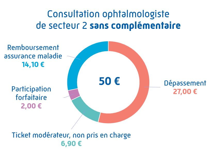Prenons l’exemple d’une consultation chez un ophtalmologiste de secteur 2 au tarif de 50 euros pour un assuré bénéficiant du régime général d’assurance maladie. Pour cet exemple et ceux qui vont suivre, nous considérons que la consultation a lieu dans le cadre du parcours de soins coordonnés et que le spécialiste n’est pas adhérent à l’Optam (option de pratique tarifaire maîtrisée).