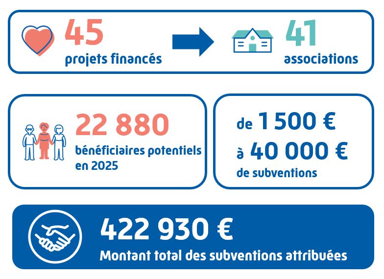 Les appels à projets publiés en 2024 permettent de financer 45 projets portés par 41 associations pour 22 880 bénéficiaires potentiels. Le montant total des subventions s’élève à 422 930 euros pour des dotations allant de 1 500 euros à 40 000 euros par projet.